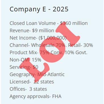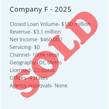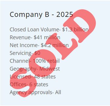 Above are a list of companies currently for sale. This is only a partial list. Our client list includes companies in excess of $3 billion per year in closed loan volume. If you don’t see a company listed below that fits your parameters, we are happy to present you with companies that do meet your parameters.